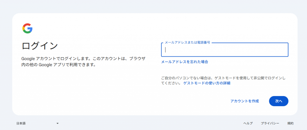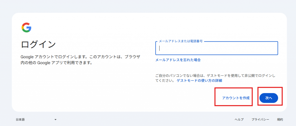 ②Googleアカウントでのログインを求められますので、すでにGoogleアカウントをお持ちの場合は「次へ」を、お持ちでない場合、あるいは新たに作る場合は「アカウントを作成」を押します。