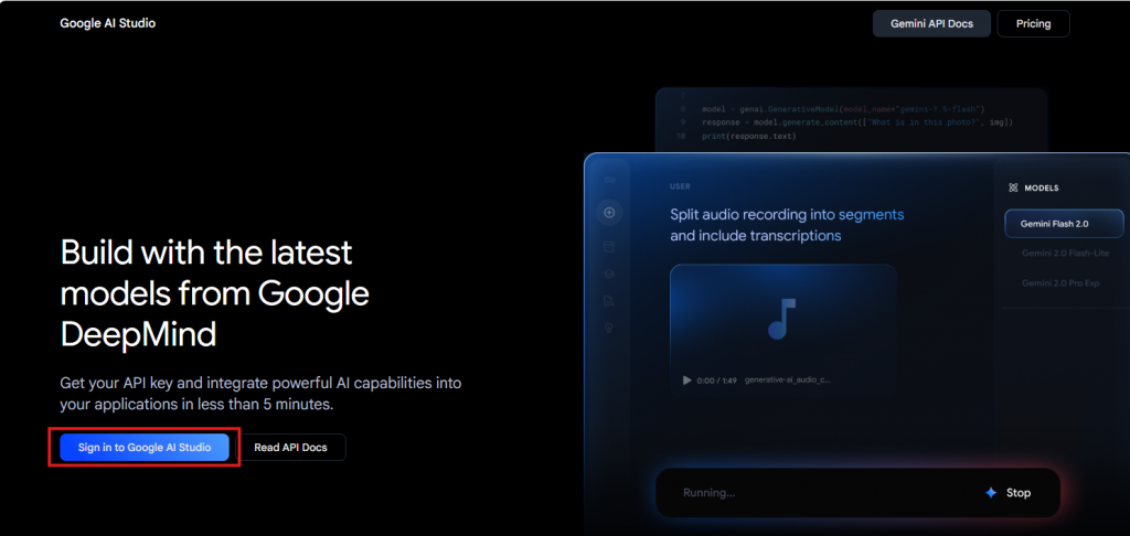 ①以下のURLを開いて、「Sign in to Google AI Studio」を押します。