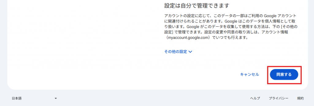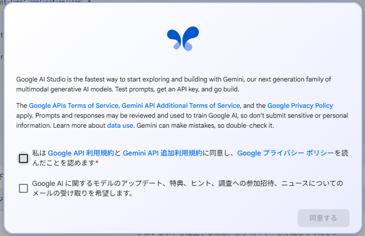 API利用規約への同意を求められますので、規約を確認してチェックボックスをチェックし、同意するを押します。