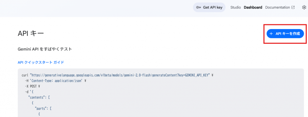 以下のような画面が表示されますので、右上の「APIキーを作成」を押します。