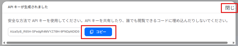 「コピー」を押してAPIキーをコピーし、テキストファイルなどに保存します。「閉じる」を押して画面を閉じます。