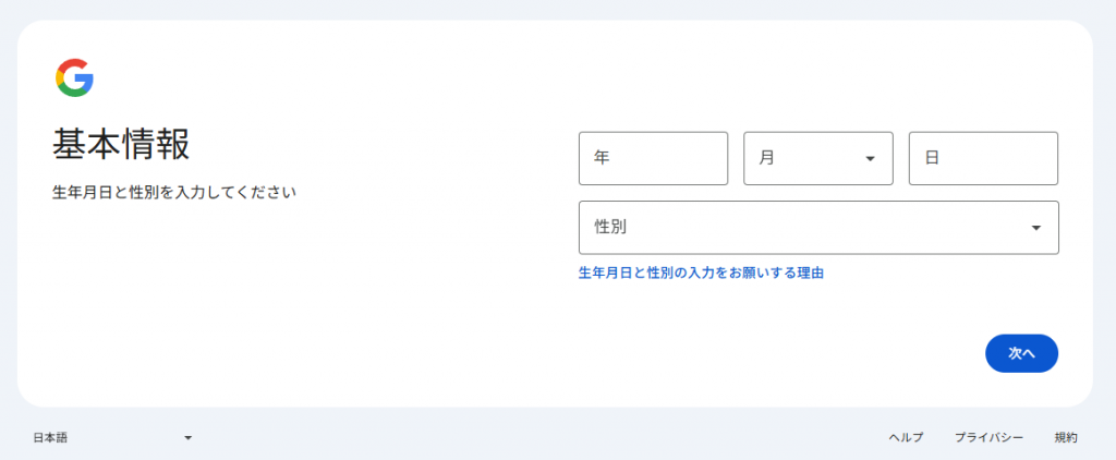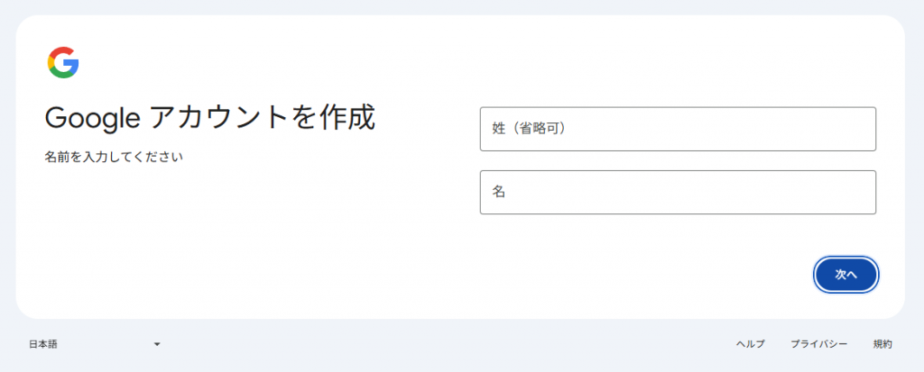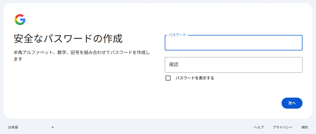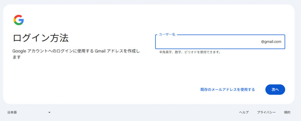 Gmailのアドレスを新規に作成しますので、メールアドレスに使用するユーザ名を入力します。