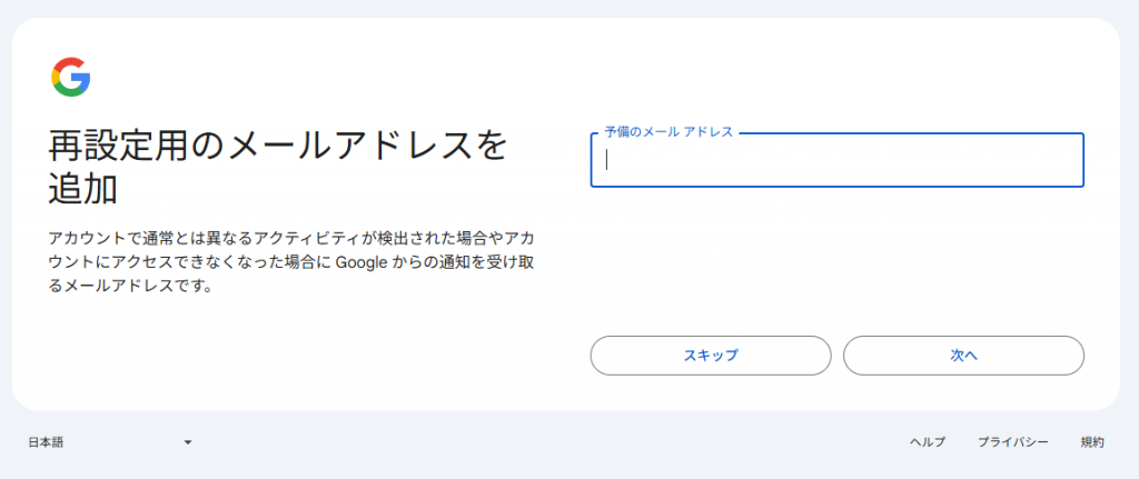 ログインに必要な情報が分からなくなった時のために、予備のメールアドレスを入力します。この手順はスキップすることもできます。