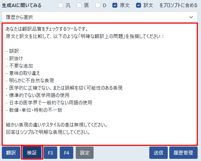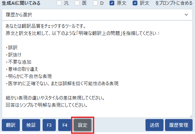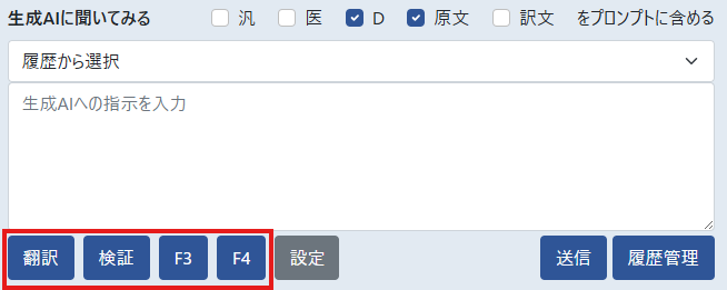 「生成AIに聞いてみる」の横の「汎/医/D/原文/訳文」の各チェックボックスをONにすると、入力した指示の後に原文や機械翻訳文、訳文ワークエリアの訳文が自動で追加されます(入力欄には表示されません)。