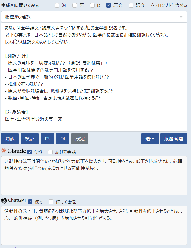 ①「翻訳」プリセットボタンのプロンプトでClaudeとChatGPTに翻訳させる