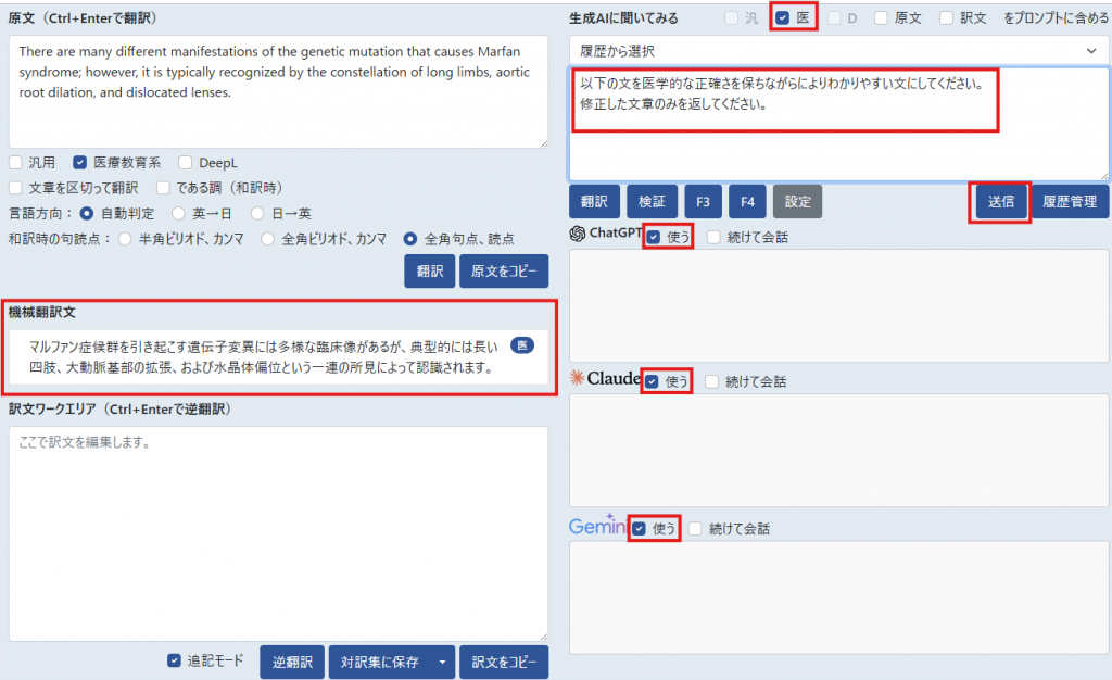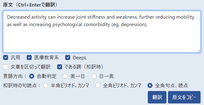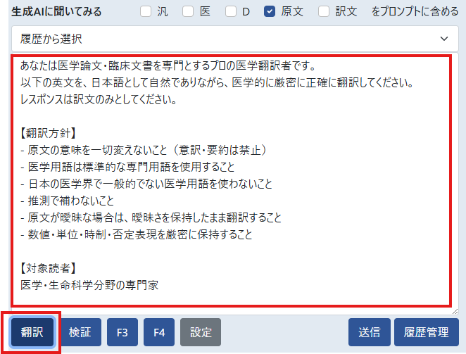 ①「翻訳」:原文エリアに入力されている英文を医学的に正確な日本語に翻訳