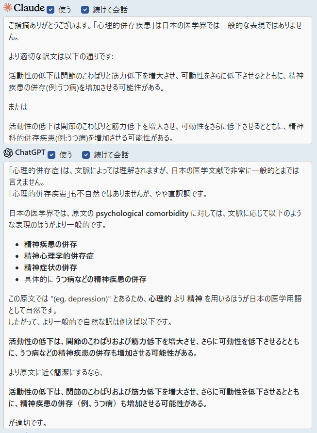 ③それぞれのAIから先ほどの訳文を踏まえた回答が表示される