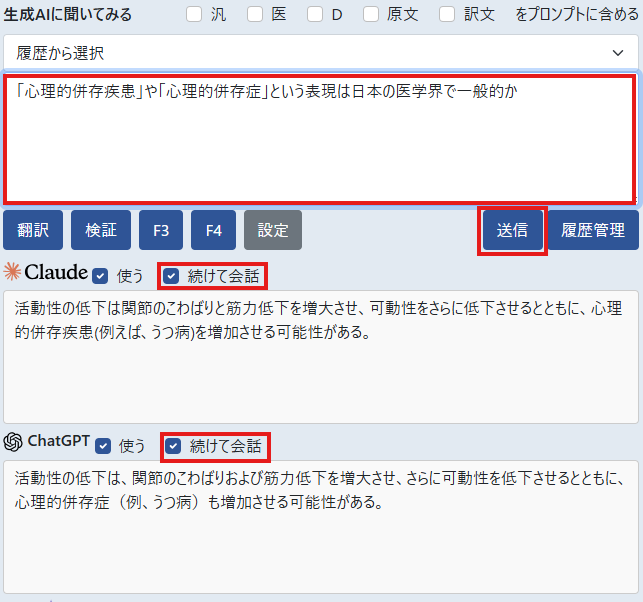 ②各生成AIの「続けて会話」をONにして、訳文で使われている用語について質問する