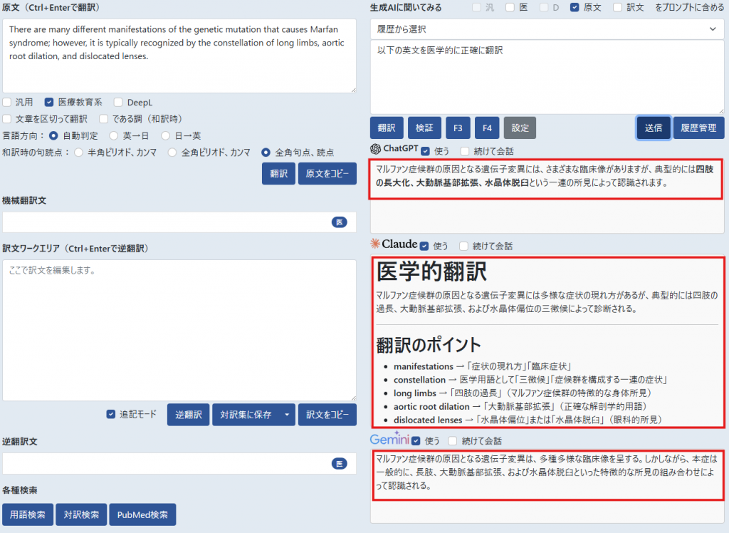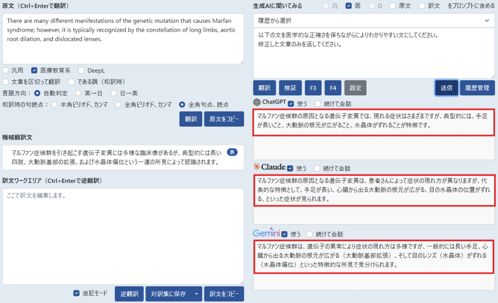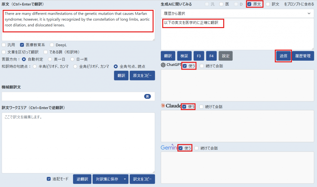 原文エリアに入力した英文を3つの生成AIに同時に翻訳させる