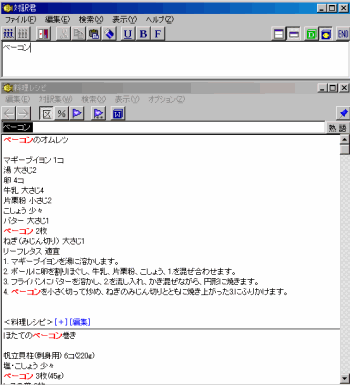 対訳登録は、なにも英語と日本語だけでするものではありません。日本語だけでもデータベースを作ることができます。ほんの一例を紹介すると、“私の料理”などの名前をつけたユーザー対訳集を作成し、気に入ったレシピを見つけたら、対訳登録します。レシピが沢山たまったら、冷蔵庫にある材料を検索入力欄に記入し、対訳枠で検索してください。買い物に行かなくてもその日の材料で作れるメニューが検索できます。
