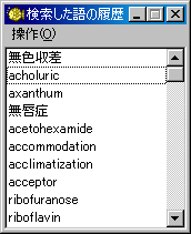 文字の入力をしながら検索を行う検索方法です。「1文字入力・削除」→「検索」→「リストの更新」をくり返しますのでスペリングが定かでない単語を探すときなどに役立ちます。ただし、お使いの環境によっては動作がギクシャクすることもありますので環境設定ダイアログの「全体」タブで設定を調整してください。