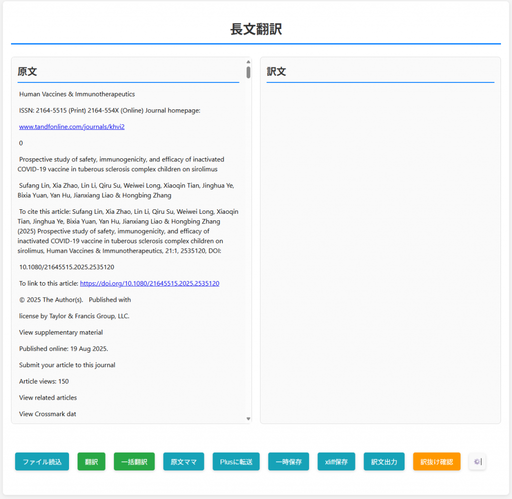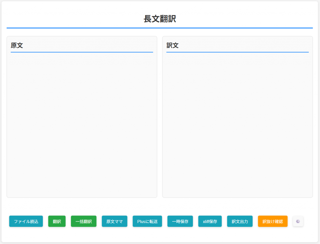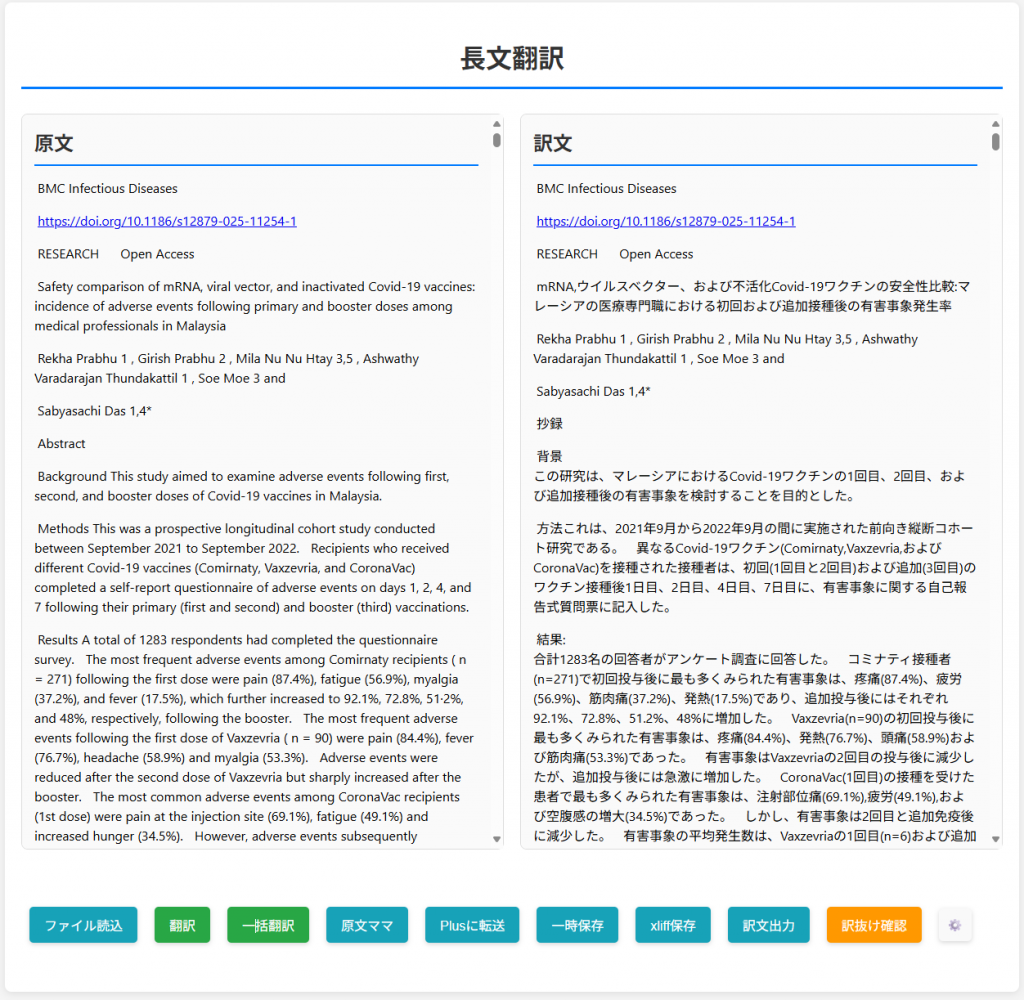 長文翻訳画面では、Wordファイルやテキストファイルを読み込んで、一文ずつ翻訳することができます。