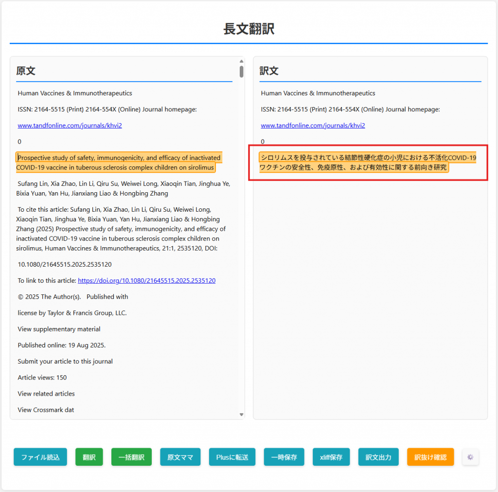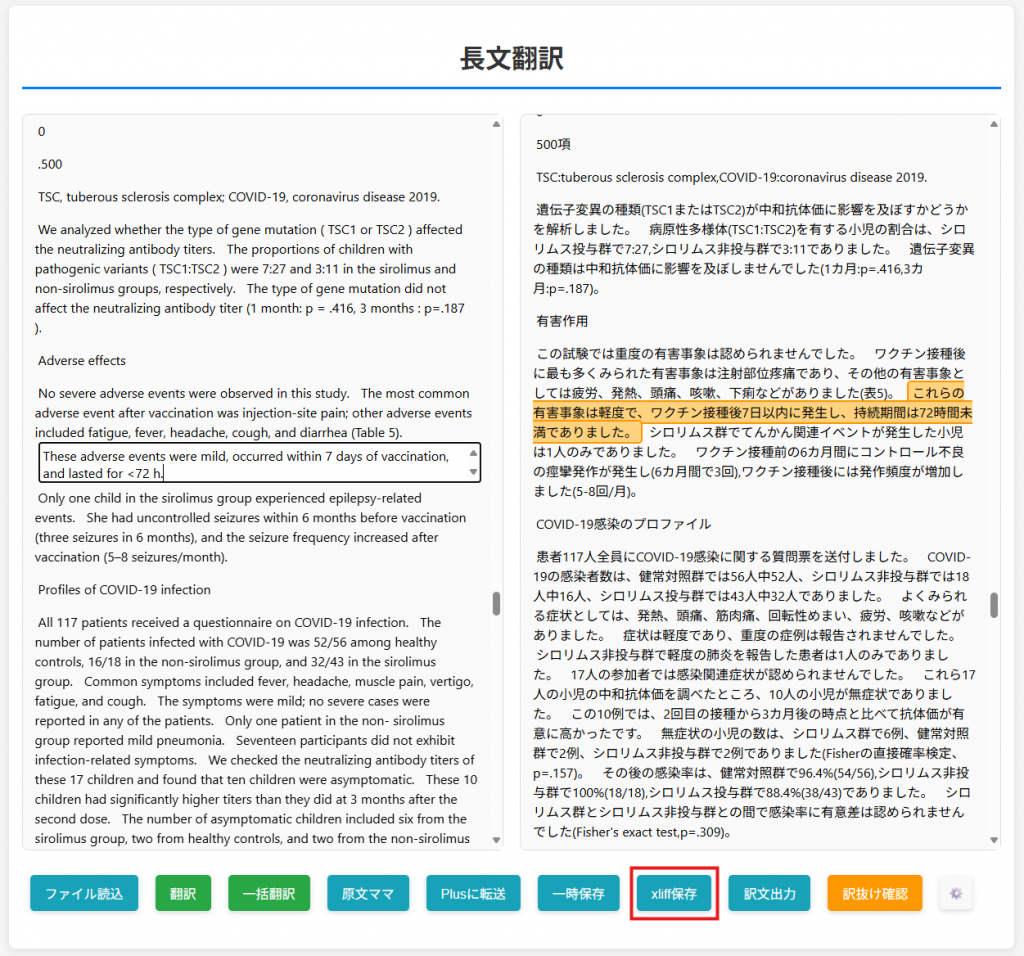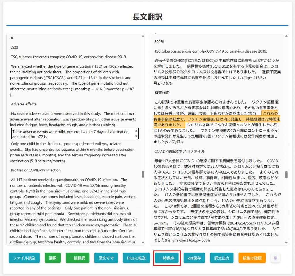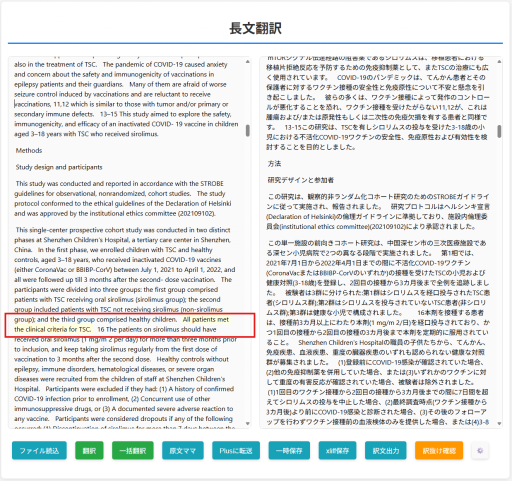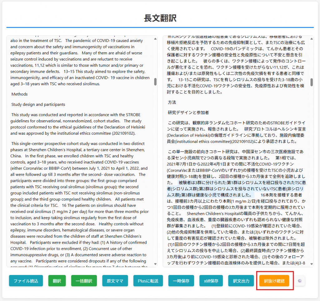 「訳抜け確認」ボタンを押すと、訳文が入っていない原文をハイライトで表示します。