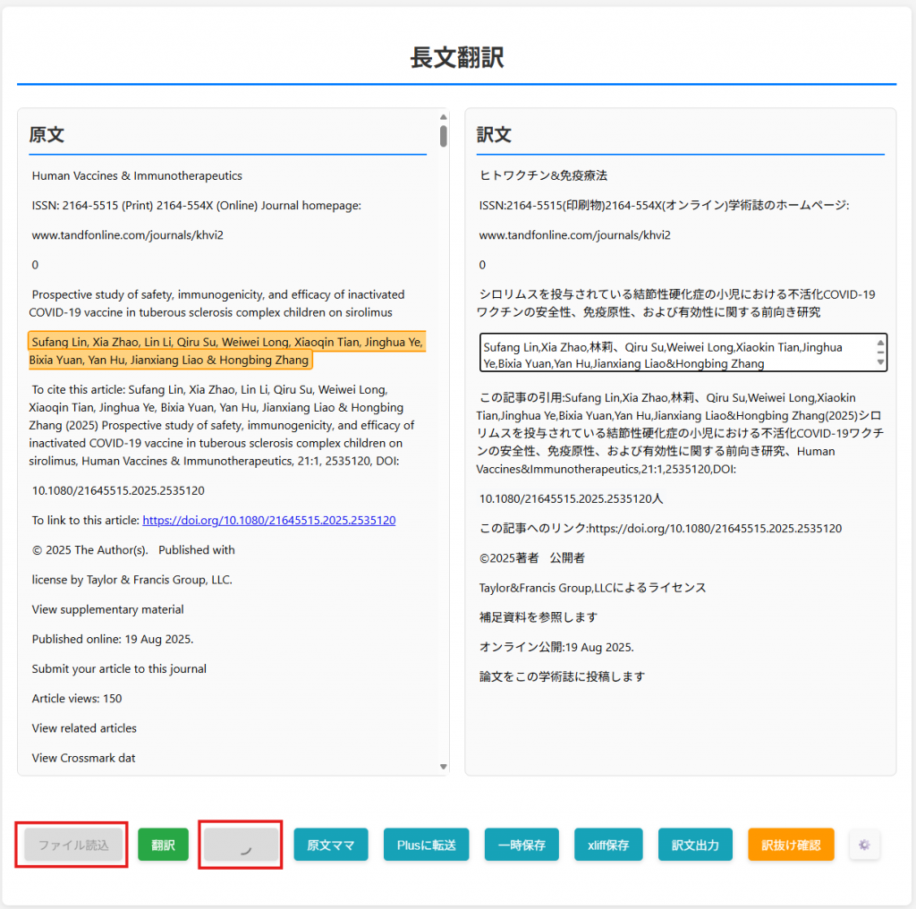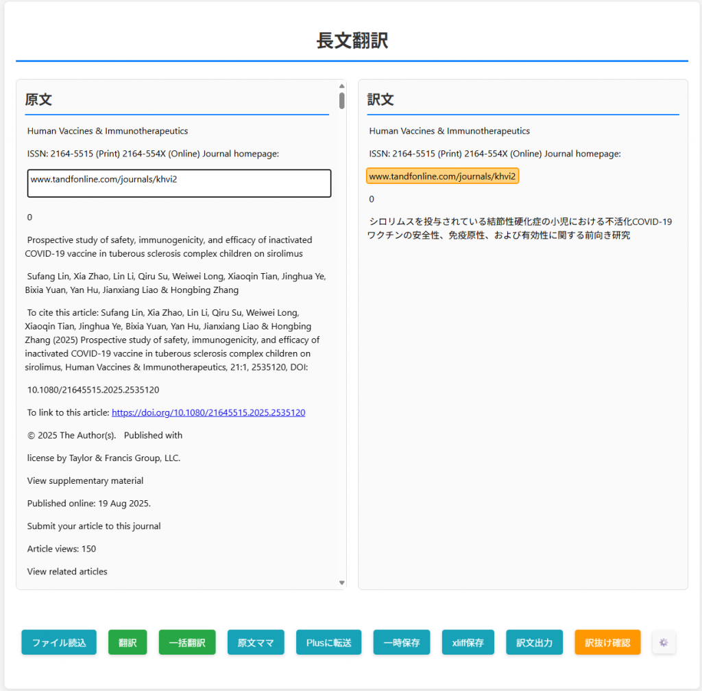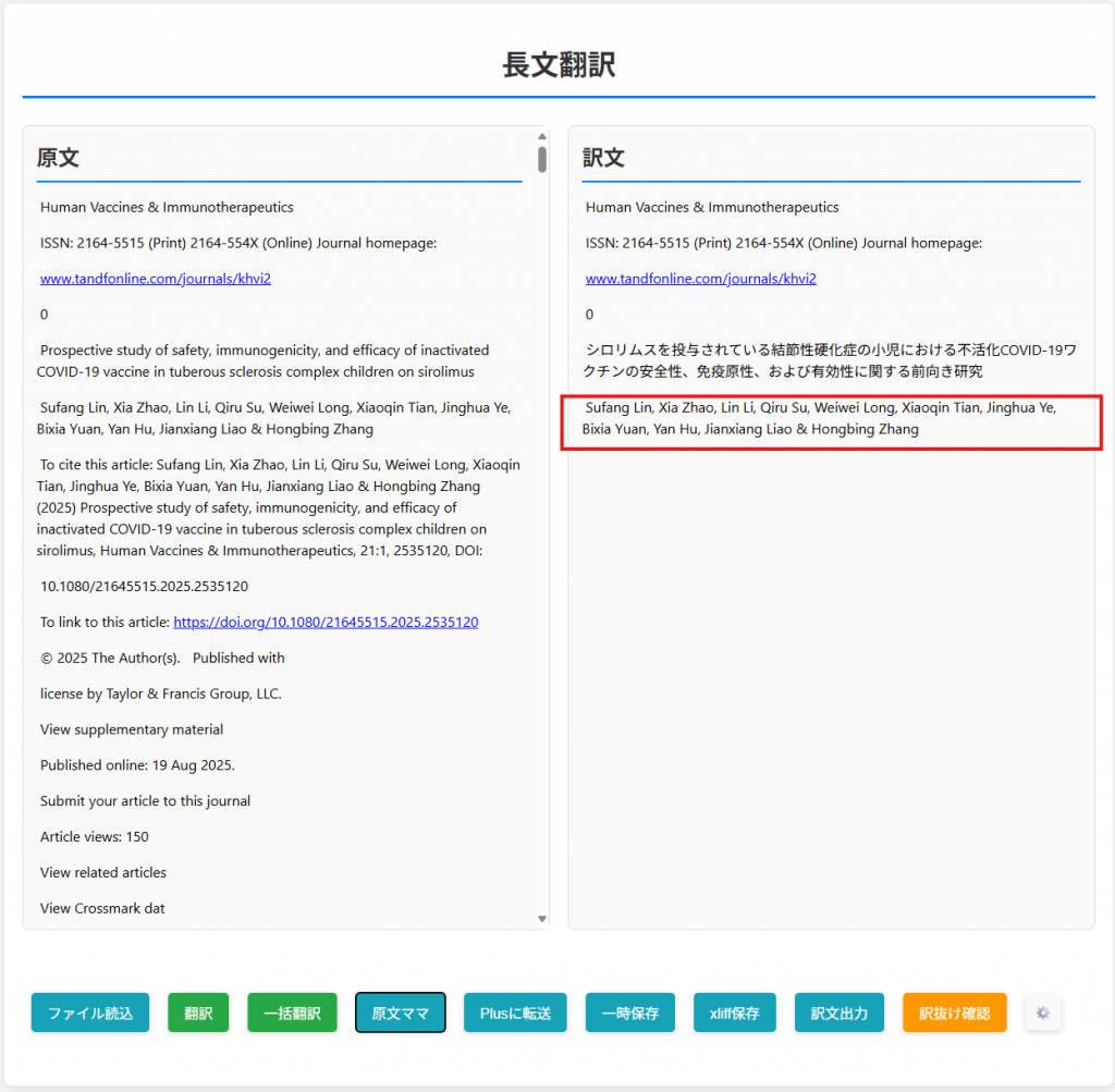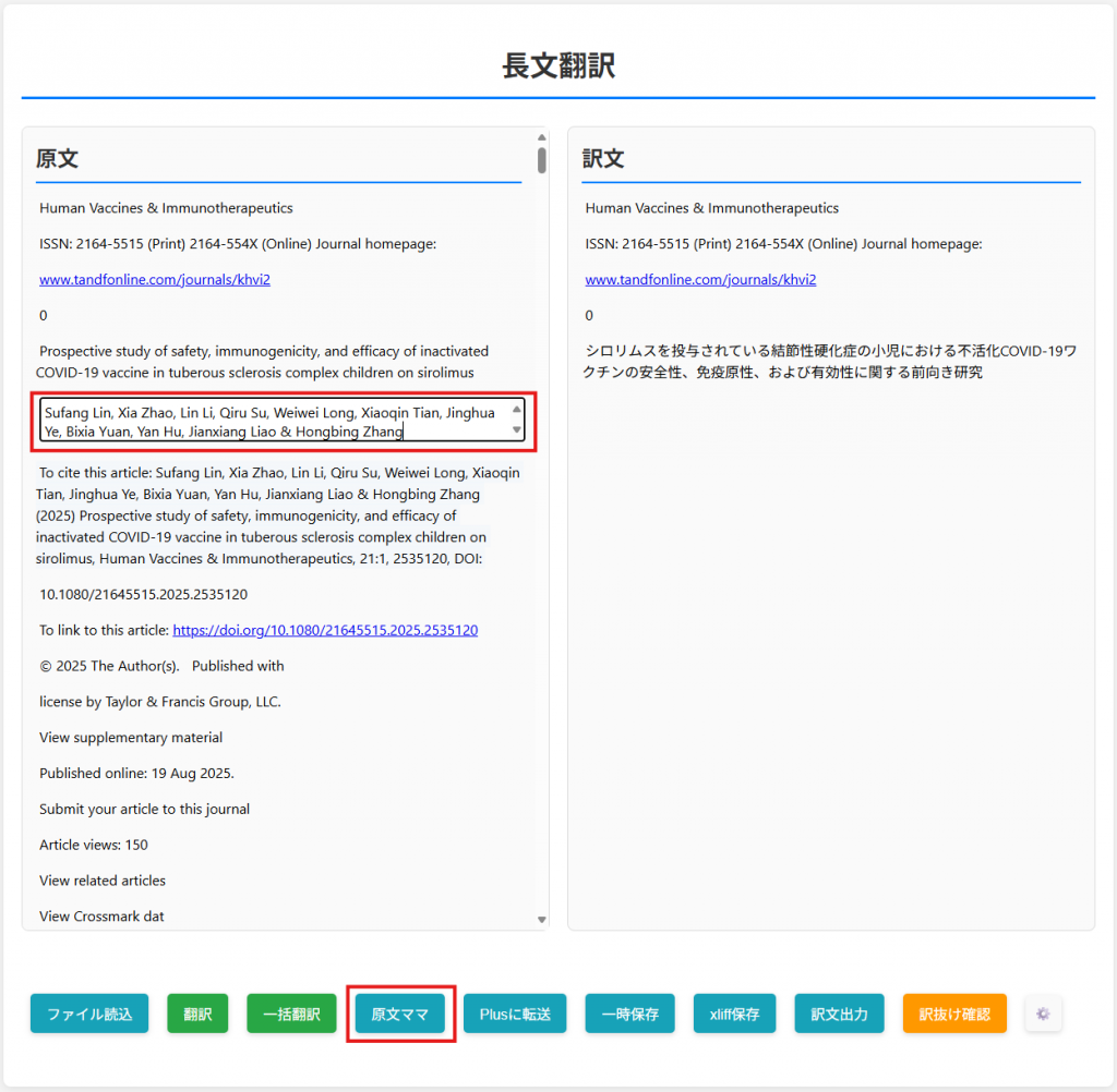 翻訳が不要な文の場合は、「原文ママ」を押すと原文がそのまま訳文エリアに入ります。