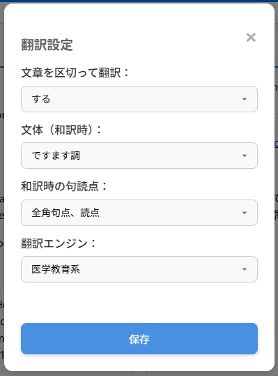 歯車ボタンを押すと設定画面が開き、翻訳時の設定を変更できます。