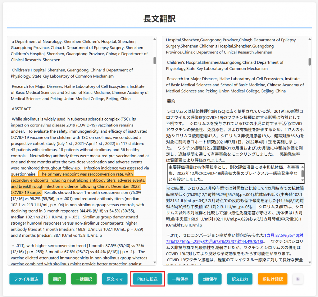 MediTRANS Plusの機能を使って翻訳したい場合は、「Plusへ転送」を押すと、原文と訳文がMediTRANS Plusの原文エリア、訳文ワークエリアに転送されます。