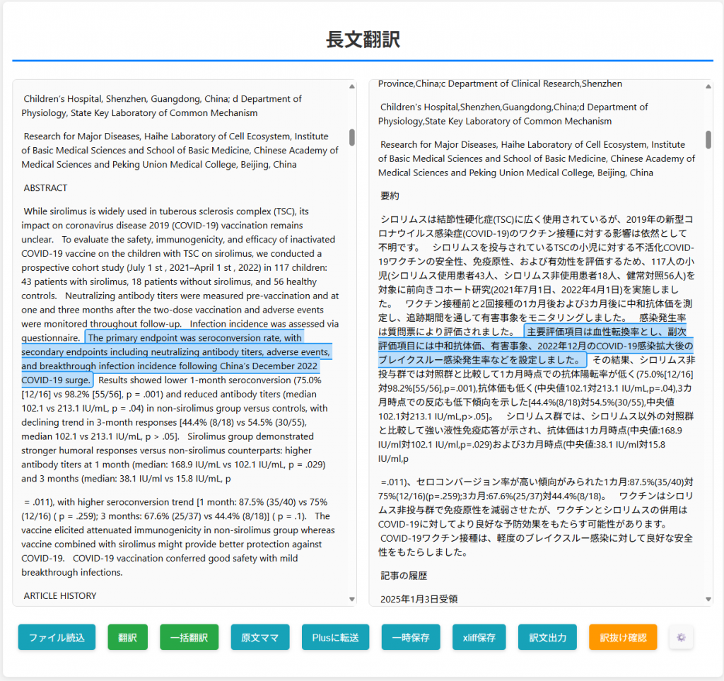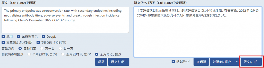 MediTRANS Plusで訳文を調整した後、「訳文をコピー」を押すと、訳文ワークエリアの内容が長文翻訳画面の訳文エリアに入ります。