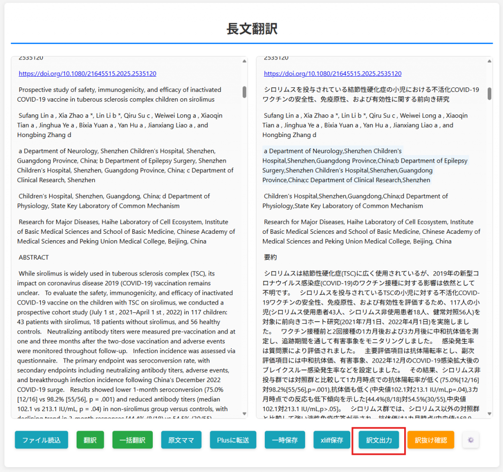 「訳文出力」を押すと訳文の内容をWordファイルとして出力できます。