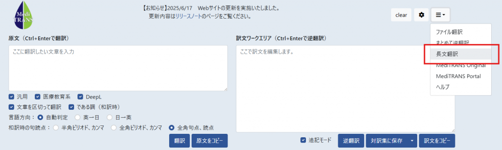 MediTRANS Plusの画面右上のメニューから「長文翻訳」を選択します。