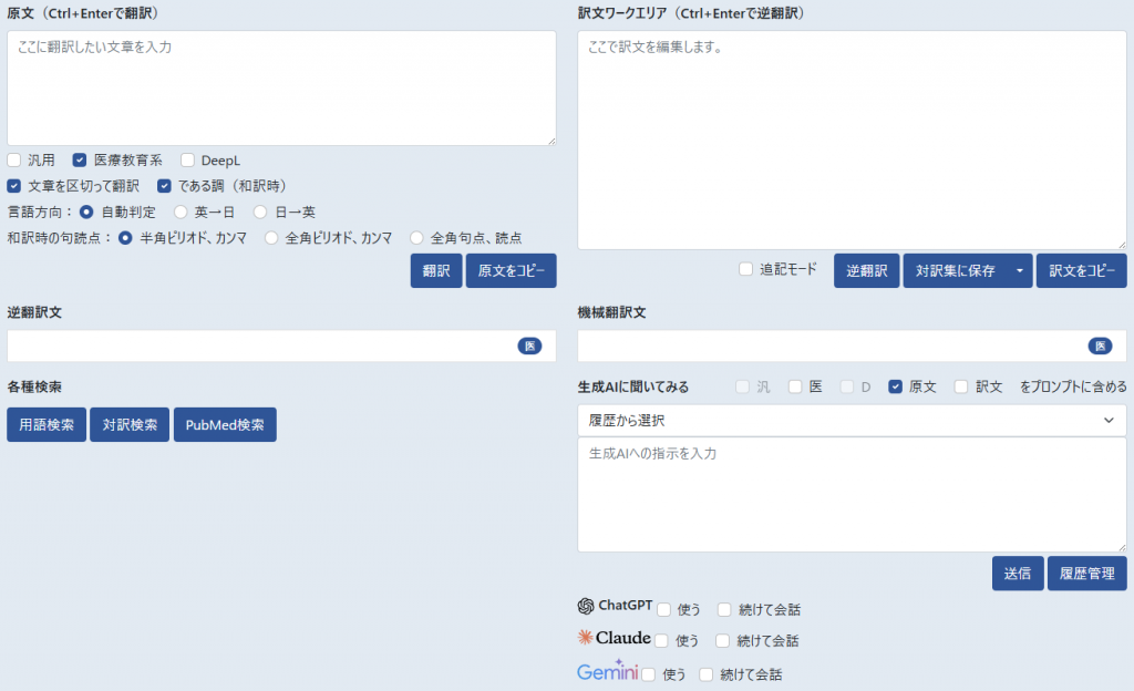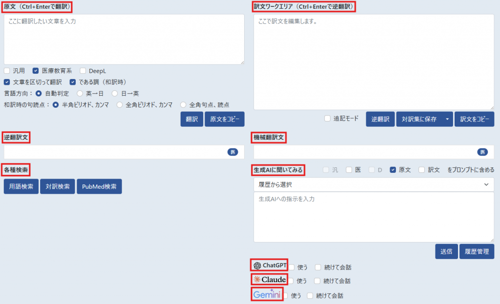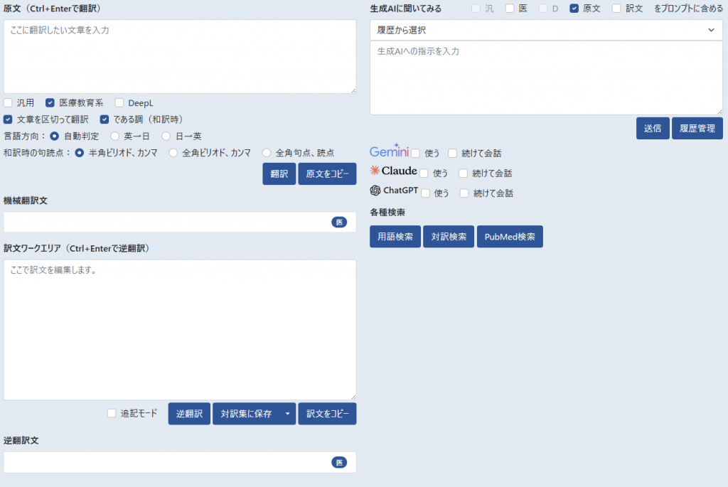 翻訳関連の要素を左の列にまとめて、生成AI関連と各種検索の要素右の列にまとめた例