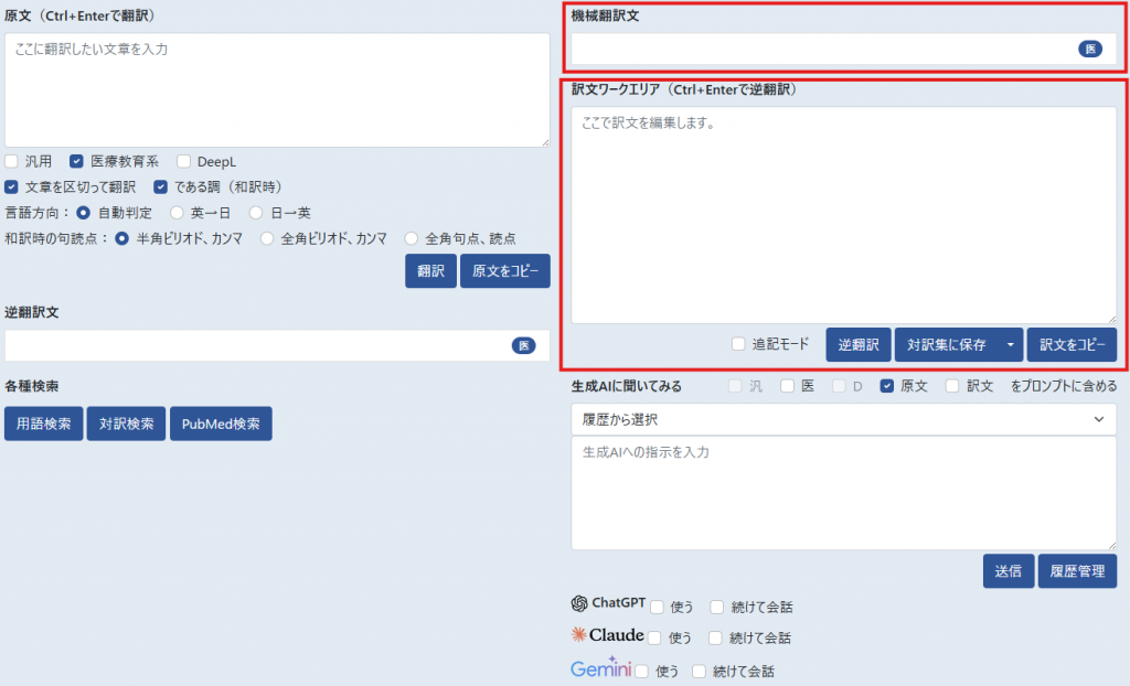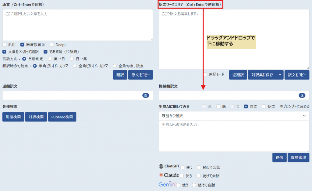 「機械翻訳文」が上に移動し、「訳文ワークエリア」がその下に表示されます。