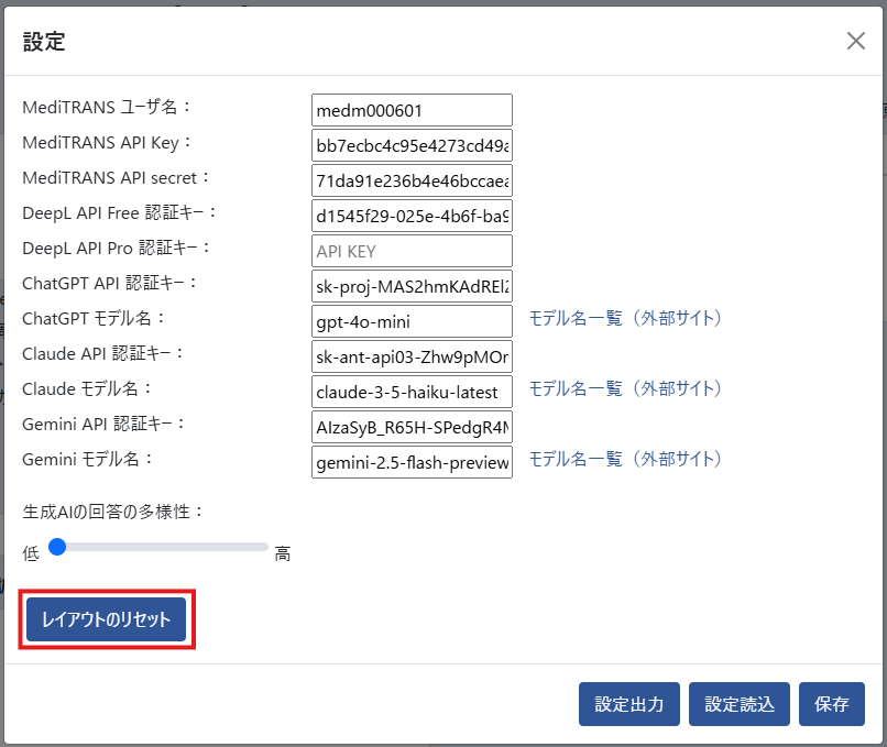 「レイアウトのリセット」を押すと即座に初期状態に戻ります。