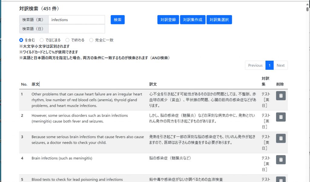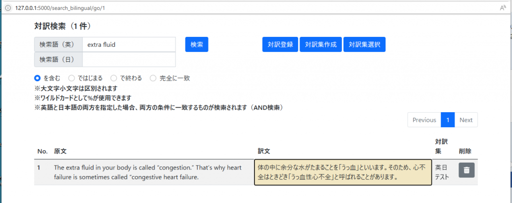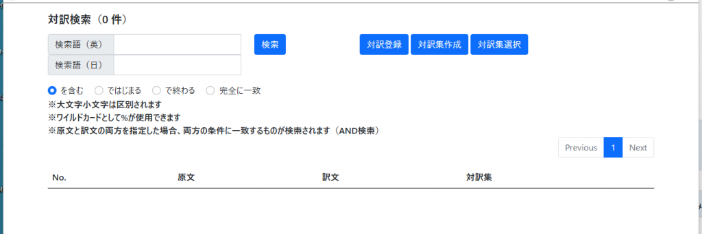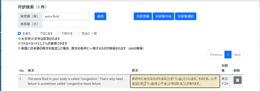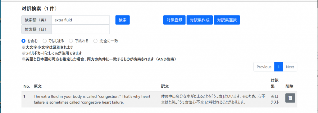 原文と訳文のセットを対訳として対訳集に保存し、検索することが出来ます。