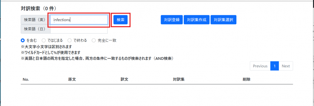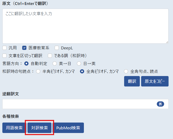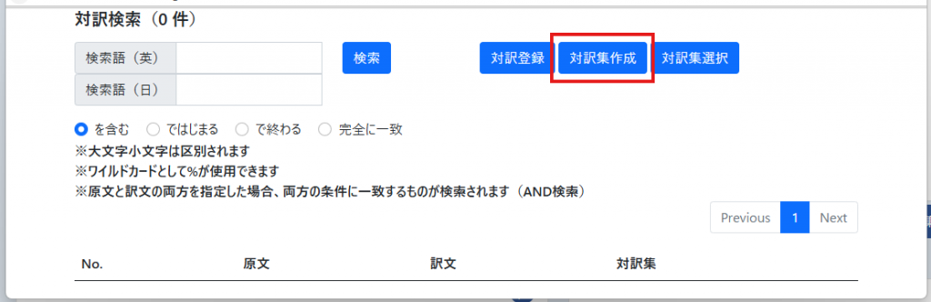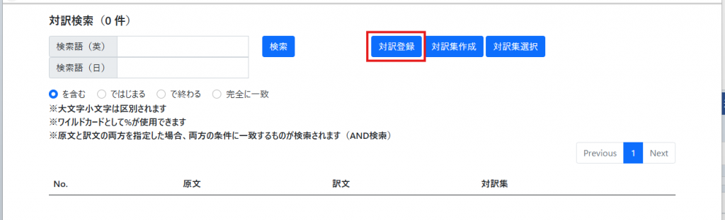 テキスト翻訳の画面で「対訳検索」を押して、対訳検索画面を開きます。