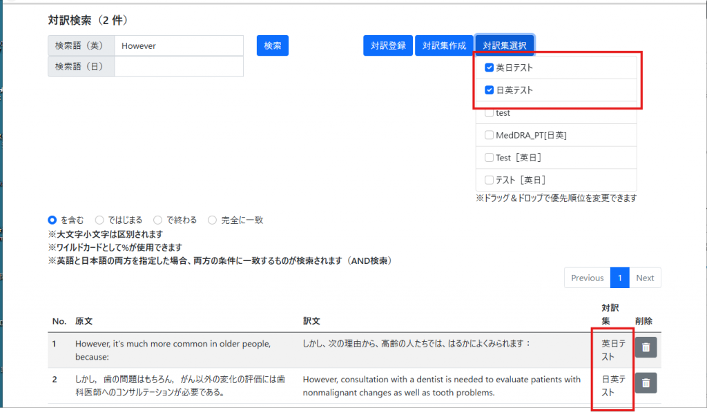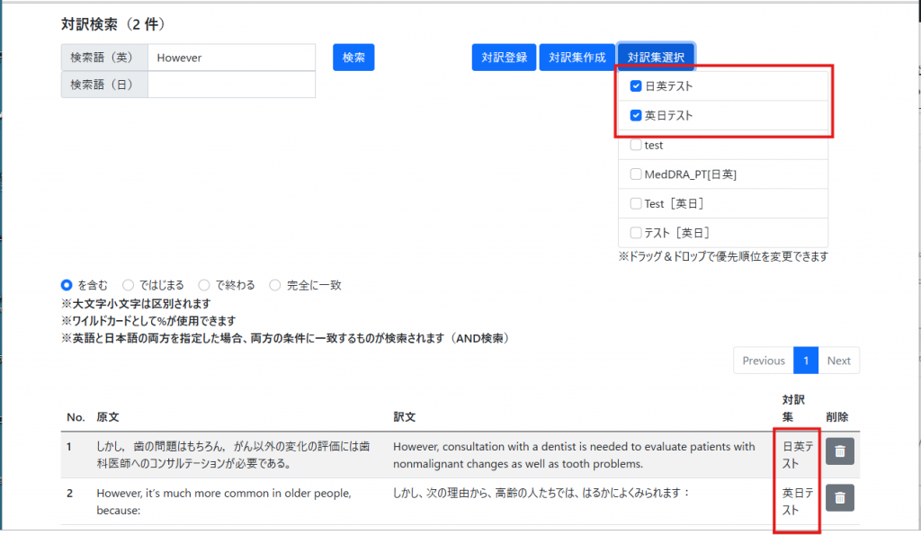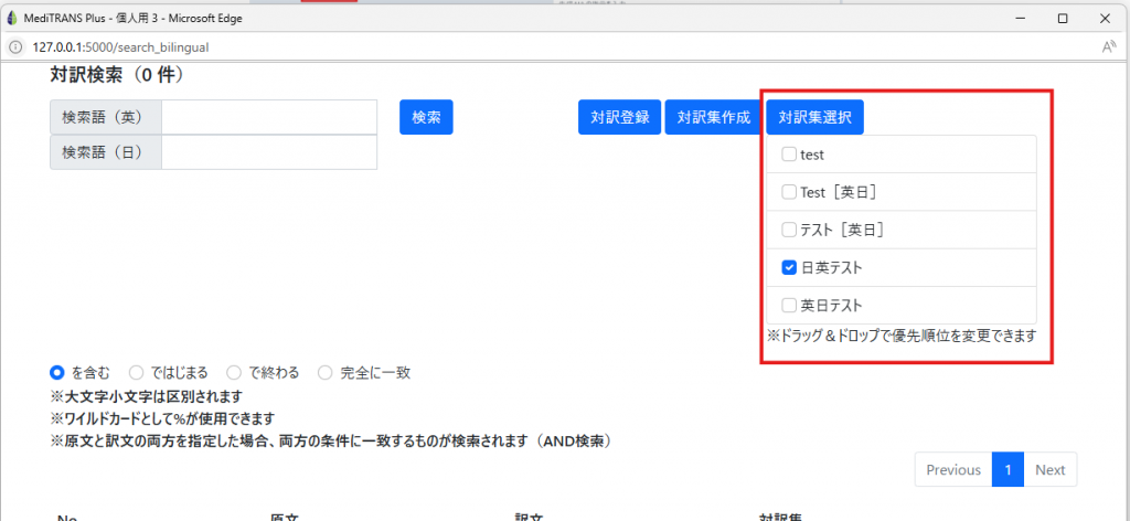 対訳集の順序をドラッグアンドドロップで入れ替えることで、検索結果での表示順序を入れ替えることが出来ます。