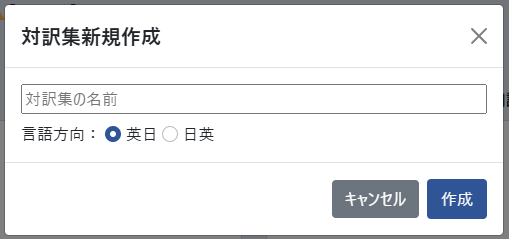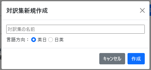 以下のような画面が表示されますので、対訳集の名前を入力し、言語方向を選択して「作成」を押します。