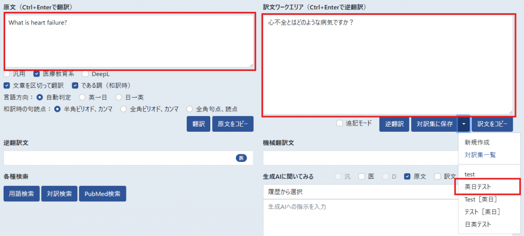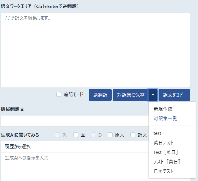 「原文」と「訳文ワークエリア」に文章が入った状態で、「対訳集に保存」ボタン横の▼を押し、登録する対訳集を選択します。