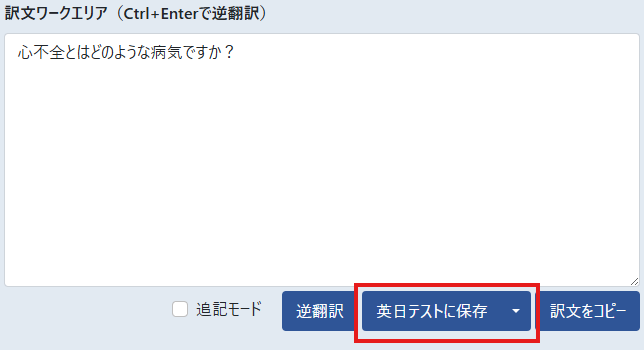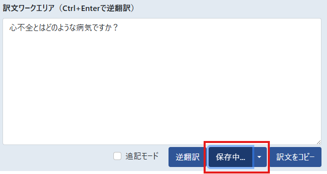 テキスト翻訳の画面では、「原文」の文章と「訳文ワークエリア」の文章を対訳集に登録できます。