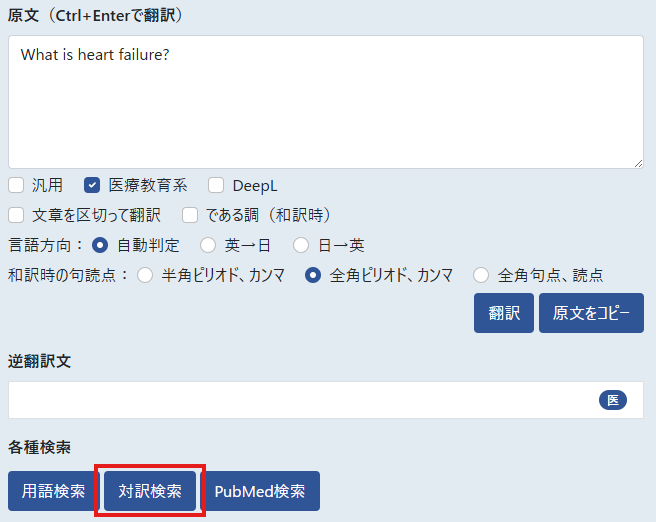 検索したいテキストを選択した状態で「対訳検索」を押すと、選択された内容で検索します。