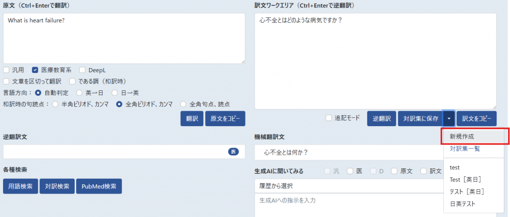 テキスト翻訳の画面の「対訳集に保存」ボタン横の▼を押し、表示されたメニューの中から「新規作成」を選択します。