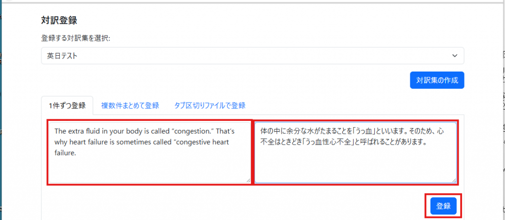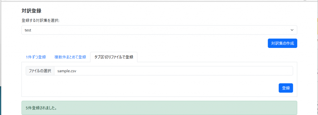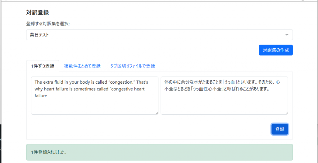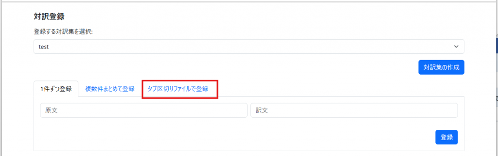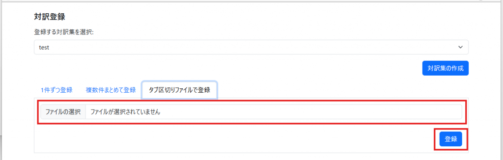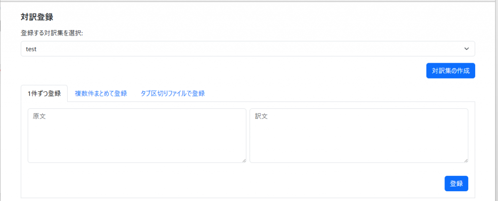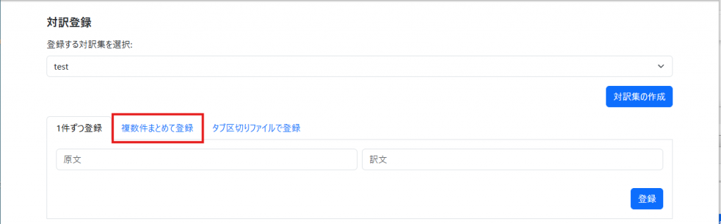 まとめて複数件を登録する場合は対訳登録の画面から行います。