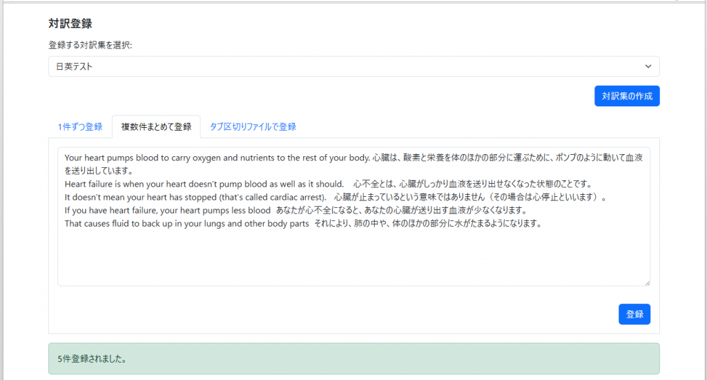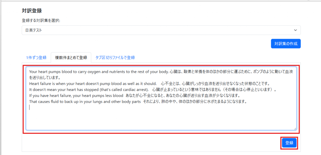 登録する原文、訳文をタブで区切って、複数の行を貼り付けます。Excelからコピー&ペーストで貼り付けることもできます。
